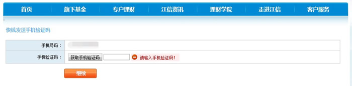 3、点击“获取手机验证码”,填写手机收到的验证码,点击继续。